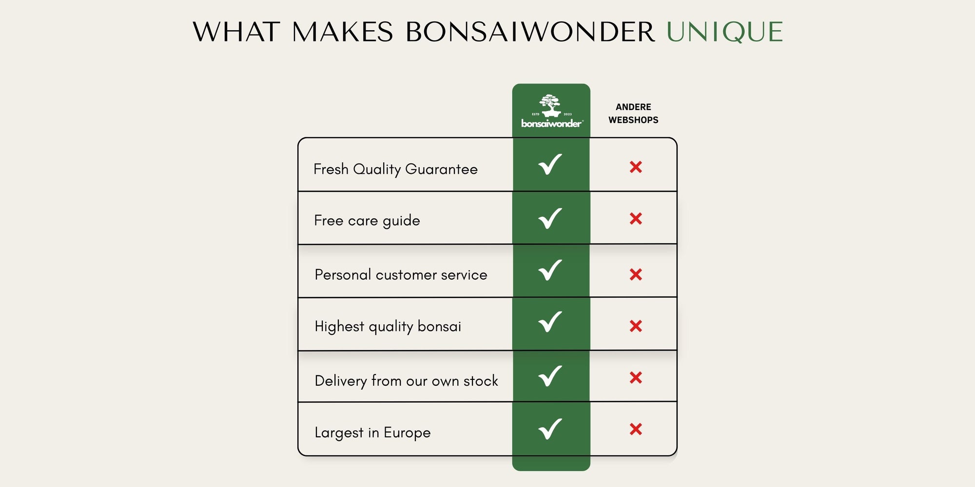 We believe that with the right care, anyone can successfully care for a bonsai. To underline this confidence, we offer our unique '60-day Bonsai Wonder Guarantee '. From the moment your bonsai is delivered to your home, you are assured of a 60-day guarantee period in which we will help you care for your bonsai. Should your bonsai die within this period, we will replace it free of charge, or offer you a voucher for use on our website. Read more about the '60-day Bonsai Wonder Guarantee'